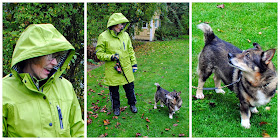 Idag tog jag Huliganen och jag den på promenad. Vi träffade Syrran och Zoya på S:t Hans backar och traskade runt. Man kunde kanske inte riktigt påstå att det regnade - men disigt var det, och liksom fuktigt i luften, så det är väl klart man skulle ha regnjacka på sig. Åtminstone om den är grön. Och har randigt foder.