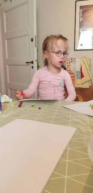 Men medan det målades och hades feber gungade vi, köpte lördagsgodis, pysslade, och sen fikade vi på balkongen med muffins som Pyret haft med. Vi gjorde plättar också - Pyret vacklade lite mellan pannkakor och plättar, men sen bestämde hon att hon ville ha hjärtplättar - så får det bli pannkakor nästa gång.