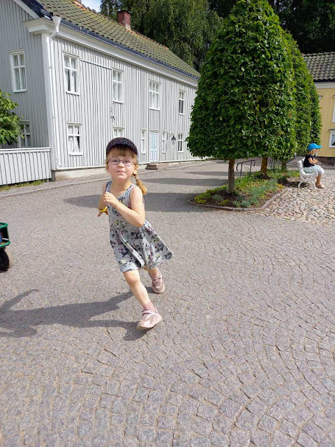Är man en liten flicka, ja då passar ju Småstaden som handen i handsken! Till och med så att man blir riktigt stor, där man står i dörren till det rosa Stadshotellet. Och varför ser nu Kickan så glad ut, ja förutom att det gör hon tämligen ofta? Jo, för på baksidan av Stadshotellet, där fanns en glassbutik! Nu kan man ju tycka att det är lite småfisigt att inte Kickan fick glass - men glassbilderna är från andra dagen på Astrid Lindgrens värld, och då hade Kickan och hennes föräldrar åkt hem.