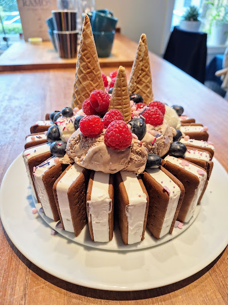 Alla ingredienser för ett lyckat kalas fanns där; gulliga barn, en raggig hund och många presenter! Vissa var till Kickan och andra var till Knyttet, men ägorätten till den studsiga enhörningen, till exempel, kan nog vara föremål för en viss diskussion. Men äsch, man kan väl dela med sig och det är jag helt säker på att Knyttet gör! Det var inte bara studsiga enhörningar, det var böcker och bord och stolar och en prickig tax och juveler som glimmade. Loppan var synnerligen intresserad, men jag får säga att hon var rätt återhållsam med att försöka slita åt sig presenterna, hon strimlade lite presentpapper och det var hon nöjd med.När vi blev bjudna på kalas frågade jag Kickan om vi skulle få tårta? - Det har vi redan ätit, sa Kickan då eftersom Knyttet ju faktiskt fyllde redan för en vecka sedan. Men visst fick vi tårta! Mamma och moster var kreativa i köket och vi serverades en synnerligen fin glasstårta.